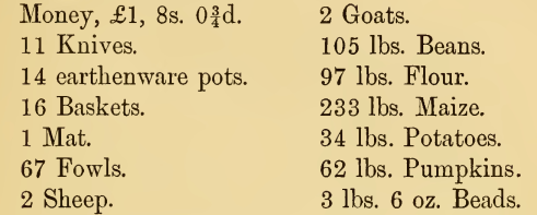 baskets, mats, pumpkins, millet, beans, potatoes, fowls, sheep, goats, and