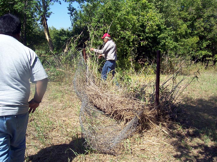 yet and Mike takes a wire cutter to cut it away from these metal posts.
