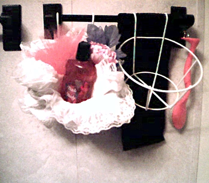 This wire basket on the right was found at the dollar store for, of course,  one dollar.  Inside the basket are a number of wash clothes with a wide lace sewn on the edge. These make a nice scrubber wash cloth for the lady wishing to cleanse the outer layer of epidemis from her face. A bottle of liquid body shampoo added to the basket makes a colorful arrangement and a nice gift for a shower.  You may also wish to roll up handtowels, a fresh bar of scented soap and the lace edged washclothes  in it for a guest bath room.
