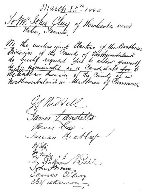 contest Northumberland. Here is the letter of which we produce a facsimile: