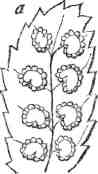 A noble crown of graceful fern was growing beside the ascending path; and I observed it just as I had groaned over my small disappointment. I gathered a frond. Instead of it being triangular in form, like those I was longing for in the wood, it resembled rather the prickly ferns; but it was broader than they in the middle, and tapered very gracefully to apex and the base. Plentiful seed-masses were sprinkled over the backs of the slightly-notched leaflets, and, upon using my lens, I found that the covers were kidney-shaped. This, then, must be what is commonly called the Male-Fern, (Las-trœa Filix-mas, figs. 1 and a.)