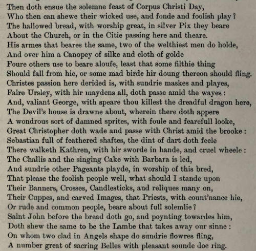 The exact nature of these plays and pageants remain shrouded in a food deal of obscurity. They have frequently been held up to ridicule; and many are the lampoons, rather unmerited, that have been made upon them. These lampoons, however, have served a very useful purpose. They supply us with interesting material as to the character of the plays which would not otherwise be in existence. Take for instance the following quotation from the "Popish Kingdom" describing the ceremonies of Corpus Christi day in Coventry:--