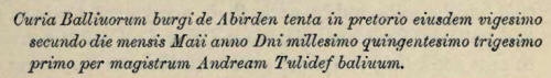 13th May, 1440—Curia Gilde tenta per prepositum in pretorio Burgi de Abirdene xiij die mensis Maij Anno Domino millesimo quadringentesimo et xlmo. Item, eodem die, per commune consilium concessus fuit Ricardo Kintor, tune Abbati de Boneacord, vnus burgensis futurus faciendus, ad libitum suum quandocunque ipsum presentauerit pro expensis suis factis et faciendis in quodam ludo de ly Ilaliblude ludendo apud ly Wyndmylhill.