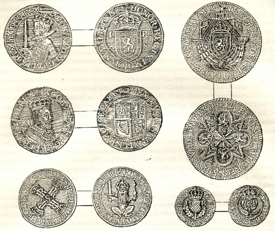 Scotiae are engravings of 13 gold and 23 silver coins of James VI., some