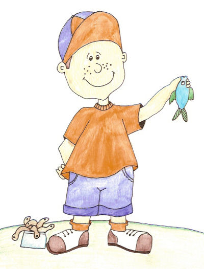 "Tim, it's time to go fishing. Do you have your worms?" His dad had a can of worms too. "I can't wait to catch some salmon in the river.