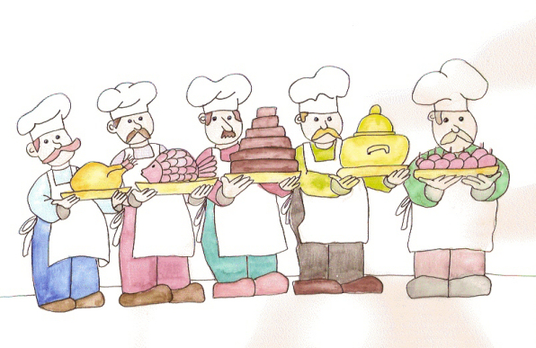 opened it and in marched five men. Each was dressed in a chef's hat and