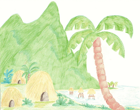 Several straw huts stood among the tall grasses. Other huts stood on wooden poles a few yards from the beach. Kamea lived in one of the huts with her grandma, Pooha. Every morning Kamea walked along the sand searching for searching for puku shells. With bucket in hand she picked up each one, dropping them among the bigger shells she collected for herself.