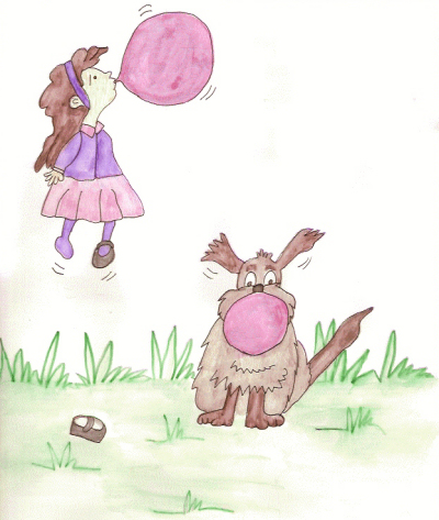 She ran into the shop and bought a packet. She ran home and sat outside in her back garden. Harry, her dog, came running up to her, sniffing the gum. “Would you like to try some, Harry?” The dog barked so Amber put a piece in his mouth. “Now I’ll try some.”
