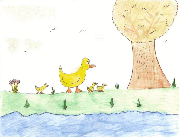 Mama duck took her three ducklings to the pond to swim. Fluffy, Jaune, and Weber. Jaune and Fluffy stayed near their mama, always waddling along in front of her. They'd never been to the pond before and didn't want to get lost.