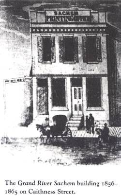 Thomas MessengerThe oldest business in Caledonia is The Grand River Sachem. It began in 1856 when Thomas Messenger came from Cayuga to start a newspaper in Caledonia. At the time he was publishing the Cayuga Sachem and was ready to expand his publishing interests. Until November of that same year, Messenger published under the banner, The Caledonia Advertiser. He then sold the Cayuga Sachem and claimed the Sachem name for his Caledonia paper.