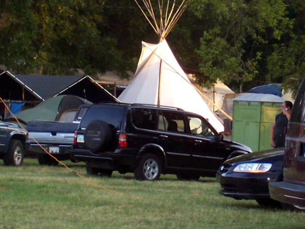 cars in front of it, the porta-potty (a necessary thing) and the man talking