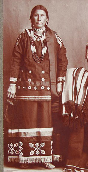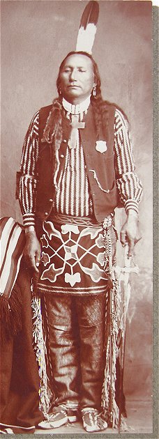 dress including a single eagle feather, beaded moccasins, and fringed,