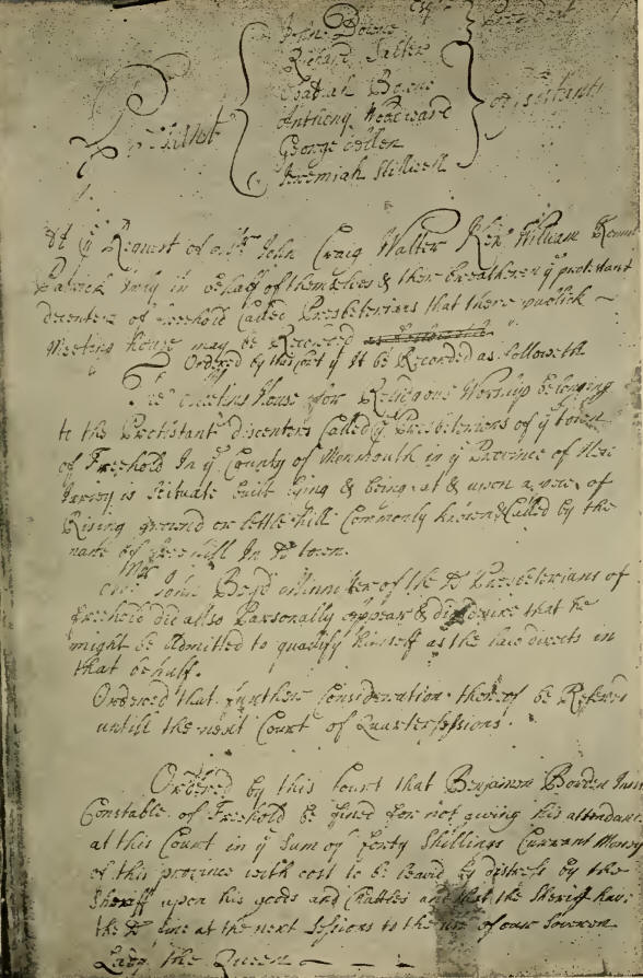called ye Presbiterians of ye Town of Freehold, in ye County of Monmouth, in