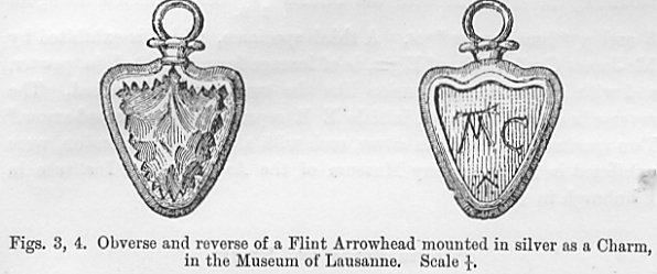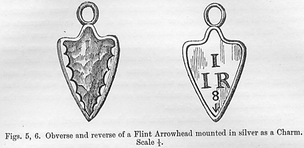 Of Scottish flint arrowheads which have been mounted in silver for use as amulets, the following specimens are either in existence or on record. Figs. 3, 4 represent the full size, the obverse and reverse, of a specimen now in the Museum at Lausanne, Switzerland, but brought from Edinburgh. The arrowhead is enclosed in a mounting of silver, which is engraved on the back with the initials A. C. separated by a star. The silver mounting is probably early 17th century work. Another which was worn suspended from the neck by an old Scottish lady for half a century is shown in figs. 5, 6. The reverse of the silver mounting is engraved with the initials I I R below which is the figure 8 and a "broad-arrow."