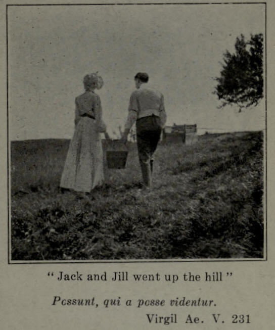 Did you ever notice that every one of these heroes is a Jack. Look up this word in an unabridged dictionary, such as The Century, which I hope you have, and note how many useful things are called Jack something, as jack-knife, jack-plane, jack-screw, jack-smith, boot-jack, and scores of others. Note that they are all made for doing things—for important service. The world could not get along without them. From its associated content the word jack would suit as well for a patriot's motto as the historic Ich Dien in the Prince of Wales's coat of arms. But I must not wander about in this fashion or I shall never get there. I have set out to tell you, my reader, what I have discovered in Jack and Jill—the poem I mean.