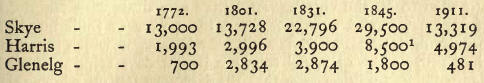 In the Highlands this is not easy, for no census, was there taken till 1851. In the following estimate I have confined m} attention to Skye, Harris and Glenelg, where the MacLeod estates were situated, but, probably, the. same causes which increased or decreased population were equally at work all over the Highlands.