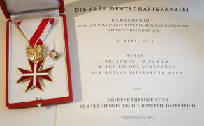 On 22 June 2011 in Vienna, the President of Austria awarded a Scottish constitutional expert and writer the Cross of Honour in Gold for Services to the Republic of Austria (Das Goldene Ehrenzeichen für Verdienste um die Republik Österreich). The ceremony in the historic Congress Hall of the Ballhausplatz, where the Congress of Vienna was held in 1814/15, was attended by two British ambassadors amongst other VIPs. This was in recognition of his work in compiling the Austrian Foreign Policy Yearbook for 16 years, and his previous 15 years as editor of the government’s foreign affairs magazine Austria Today, as well as numerous special assignments, many of them still highly confidential, on behalf of the Republic.