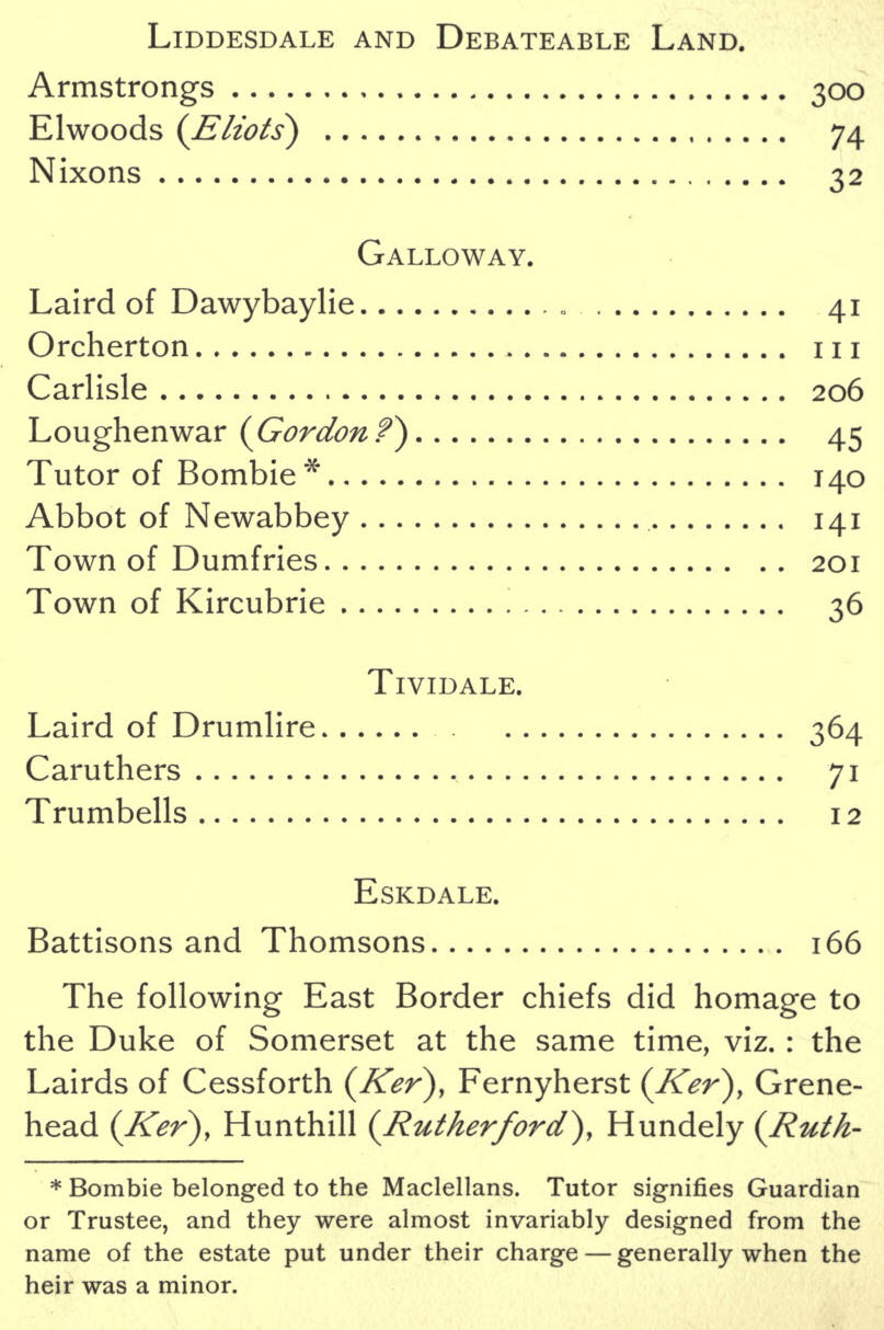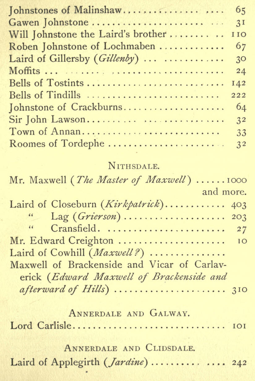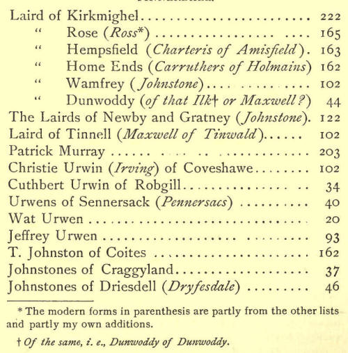 Monipenny says the last twenty-one, viz.: the Irvings, Bells, Carlisles, Grahams, Thomsons, Romes and Gasses, were "Chief men of name not being lairds."