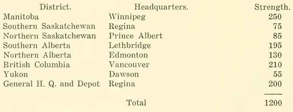 The extension of jurisdiction and duties has required a reorganization of the force and a redistribution of its strength. The boundaries of the old district have been cancelled. Regina is still the headquarters of the force. Western Canada is divided into seven police districts as the following table will show: