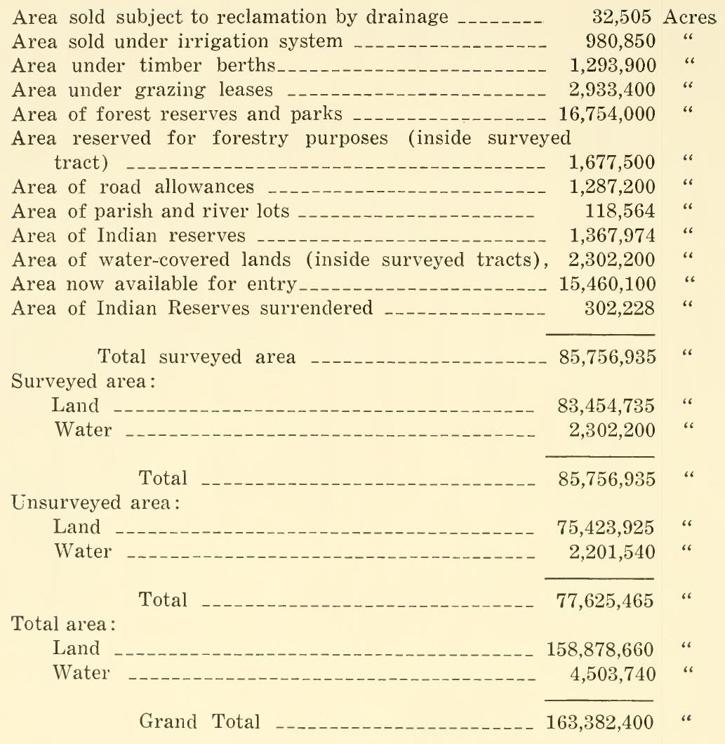The total area of Alberta is placed by the Department of the Interior at 163,382,400 acres. Of this area 85,756,935 acres have been surveyed and the disposition of such lands is shown in the following statement at the end of the fiscal year, March 31, 1922: