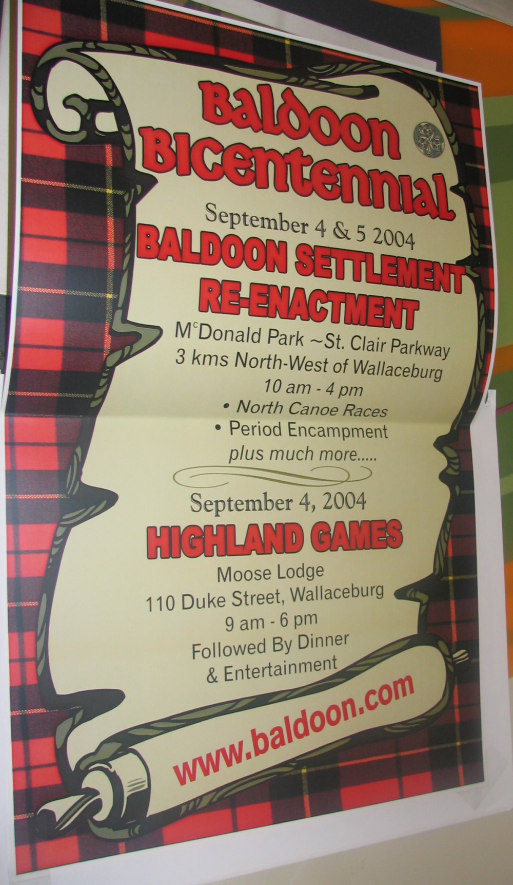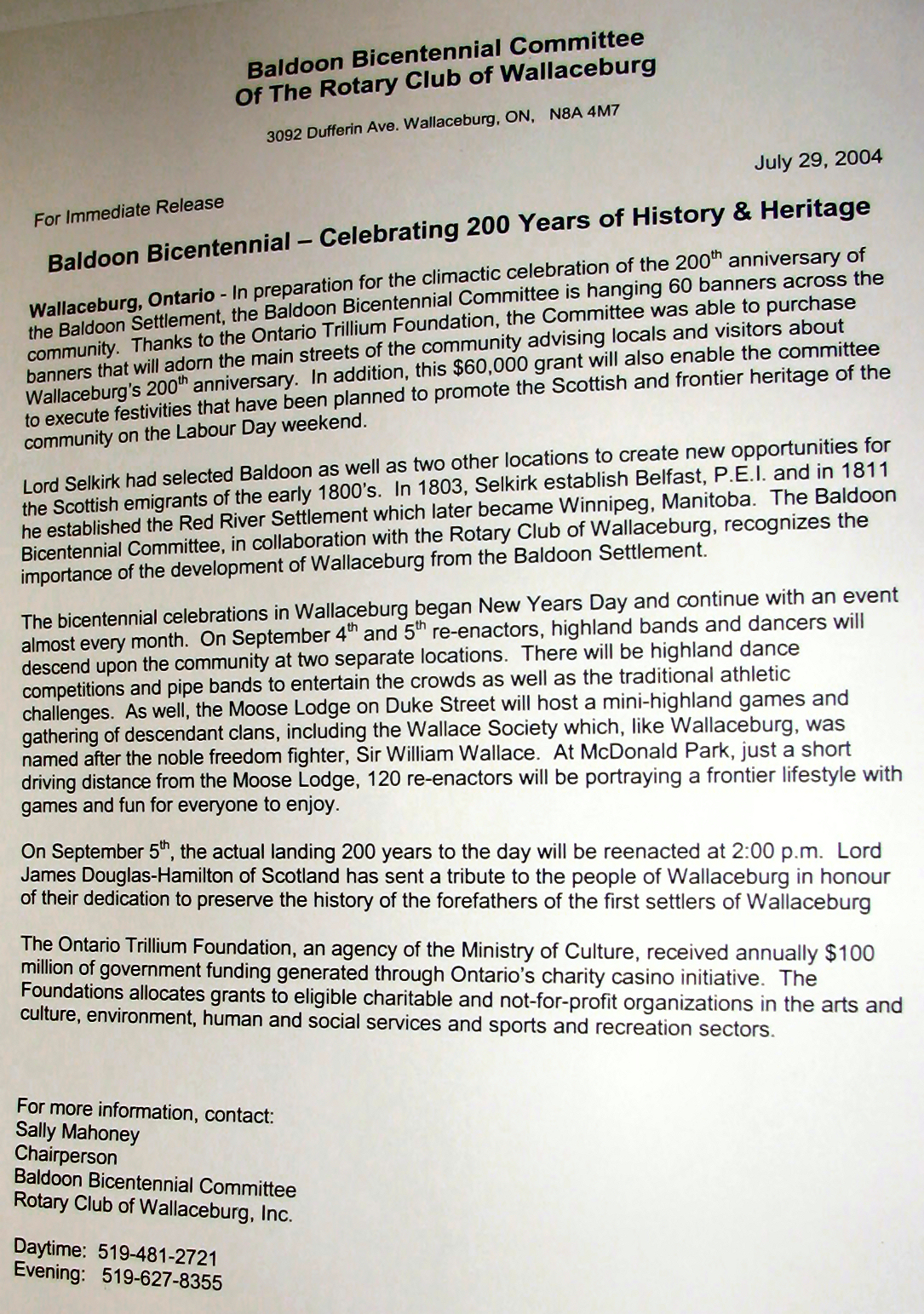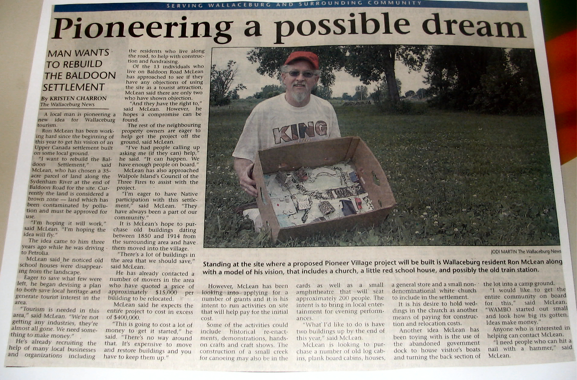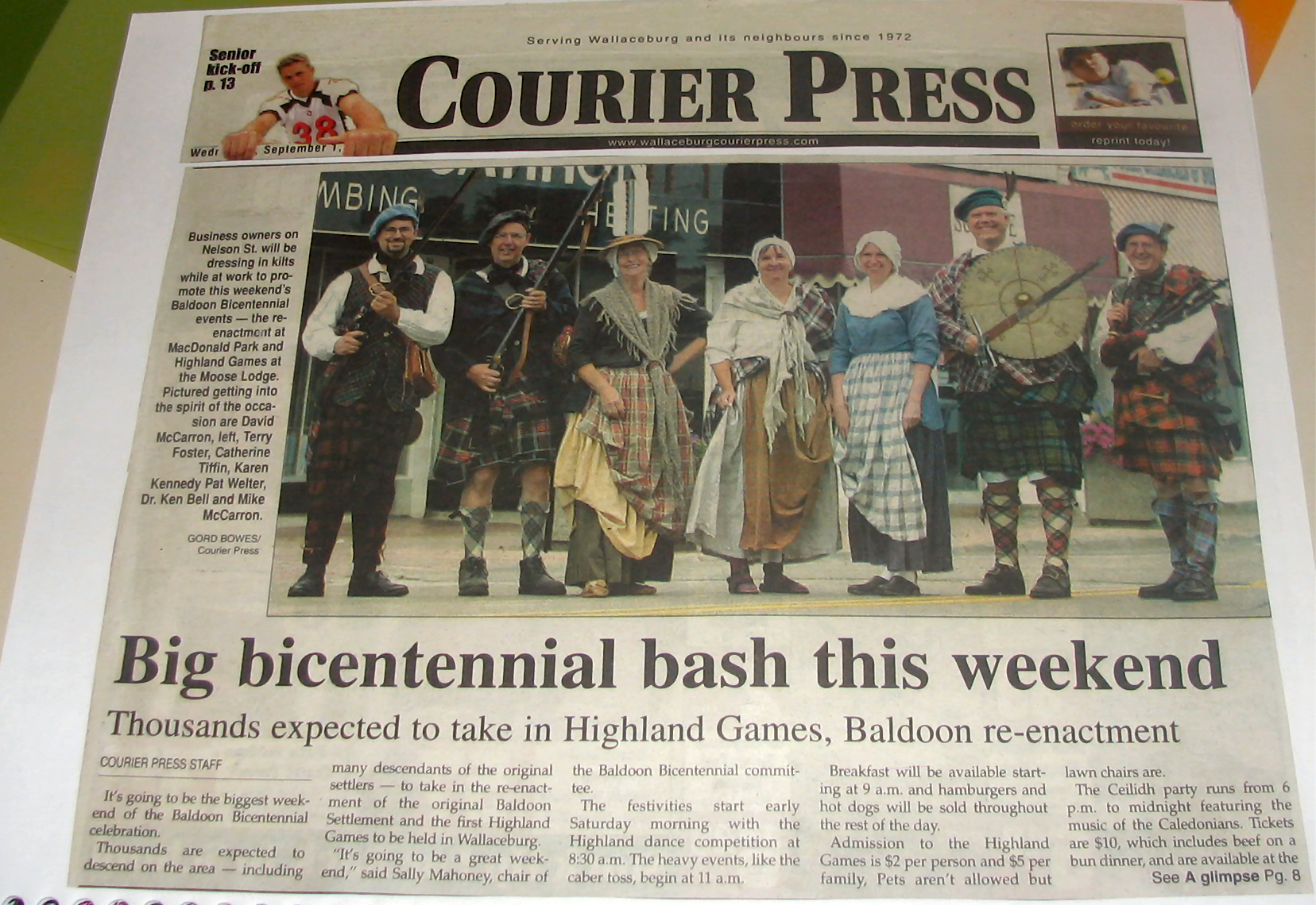In 2004 Sally Mahoney was involved in the Baldoon Bicentennial 1804 - 2004 and when I visited her at her business, Cork 'N Keg in Wallaceburg, she kindly let me take some photos from her scrap book of the celebrations. At the same time she also showed me the giant mural that will be going up later in September onto a building on Wallace Street, Wallaceburg which I hope to attend. I did get a sneak preview just in case I don't make it.