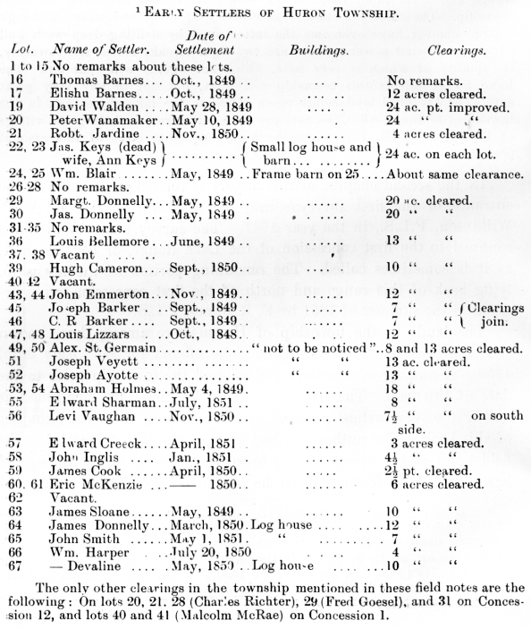 Names of the heads of families who settled on the 4th concession of the township of Huron : Norman Smith, Murdoch McDonald, Donald McDonald (Sly), Malcolm Smith, Duncan McLennan and his five sons, Donald, Neil, John, Sr., Alexander and John, Jr., and John McLeod and son John.]