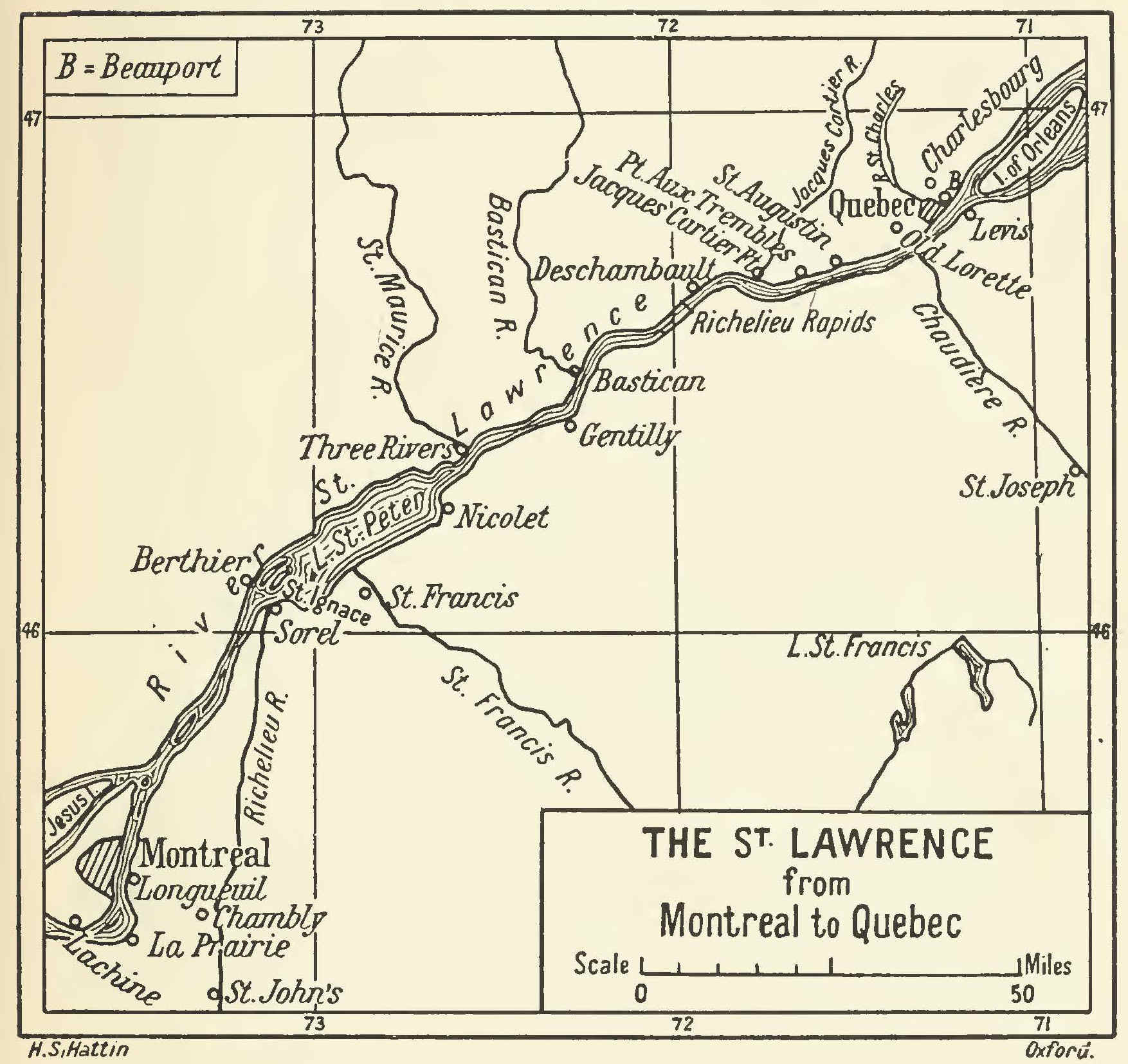 The point on the river probably most easy of defence was Deschambault, some nine or ten miles above Jacques Cartier. There the Richelieu Rapids made passage difficult, for the channel was shallow and full of rocks, which at low tide appeared above the surface. Powerful batteries at this point could have checked an ascending fleet. Murray had, indeed, planned to seize this place in the spring so as to make impossible the further ascent of French ships which might reach Quebec.1 The French had placed a battery in the church at Deschambault, and this began to play on the British ships as they tried to work their way up the channel. Adverse winds helped the French to delay for about ten days a part of the fleet. A lieutenant and three privates were killed by their fire. But, owing to bad powder and to bad guns, the resistance was really weak, and when, on the 26th, there was a favourable wind, the fleet sailed on without further injury. At no other point on the river had the French the slightest chance of retarding the British advance. Indeed, though the ascent of the St. Lawrence involved difficult and intricate navigation which taxed the skill of Captain Deane, the officer in command, not a single ship was lost or even damaged during the entire journey.