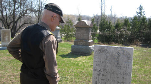 Jim reads the tombstone of Alex Patullo and Jane Watson, deceased in 1828 and