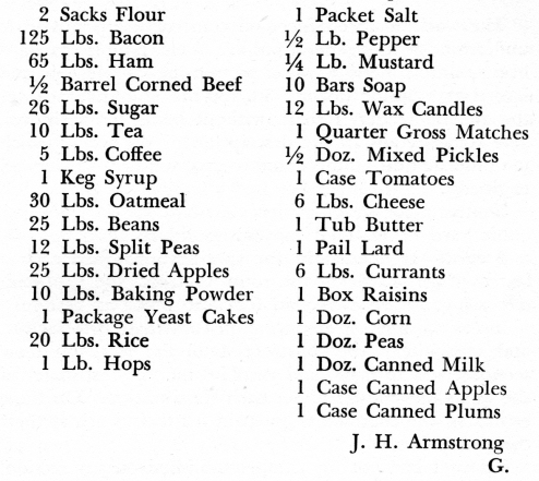 I have in my possession a circular letter sent out by Armstrong to engineer's camps on construction, for their guidance in ordering supplies. It is an interesting reminder of how we fared in the way of food. It is handwritten, with the exception of the printed letter-head. This is the letter-head: