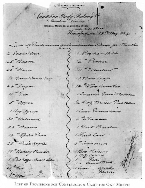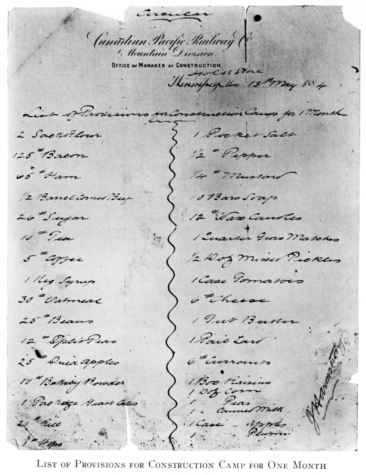 Other articles of food, such as prunes and canned peaches, were obtainable as alternatives to similar items on this list. We got fresh meat too, occasionally. This was delivered to the camps by the butchers at the improvised slaughtering grounds along the route of the railway under a contract with W. R. Hull — then a resident of British Columbia; and in after years a prominent citizen of Calgary.
