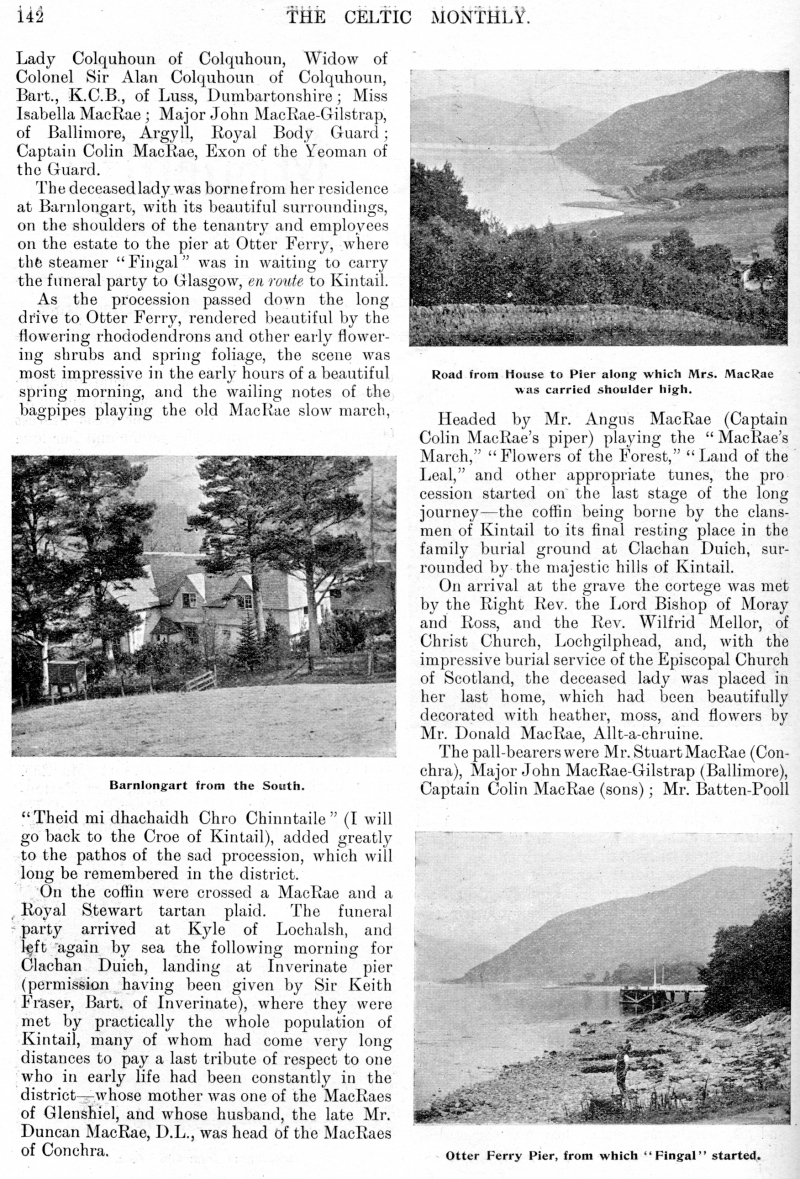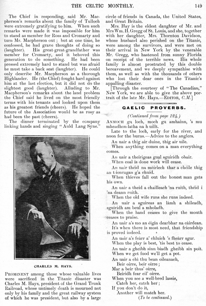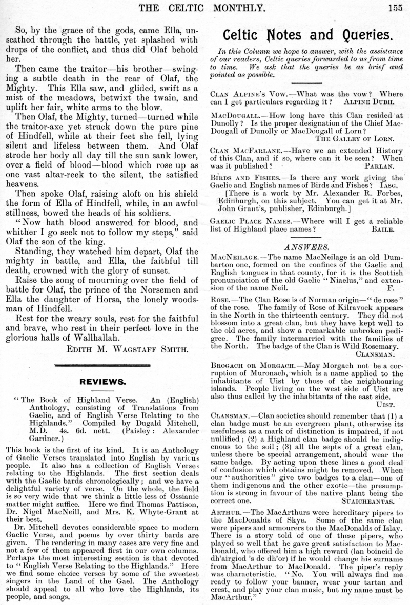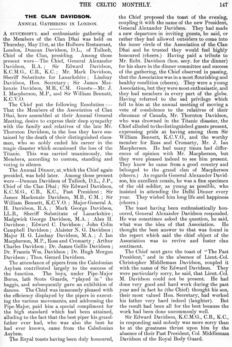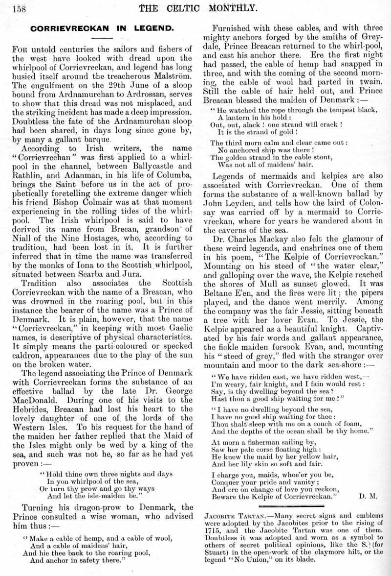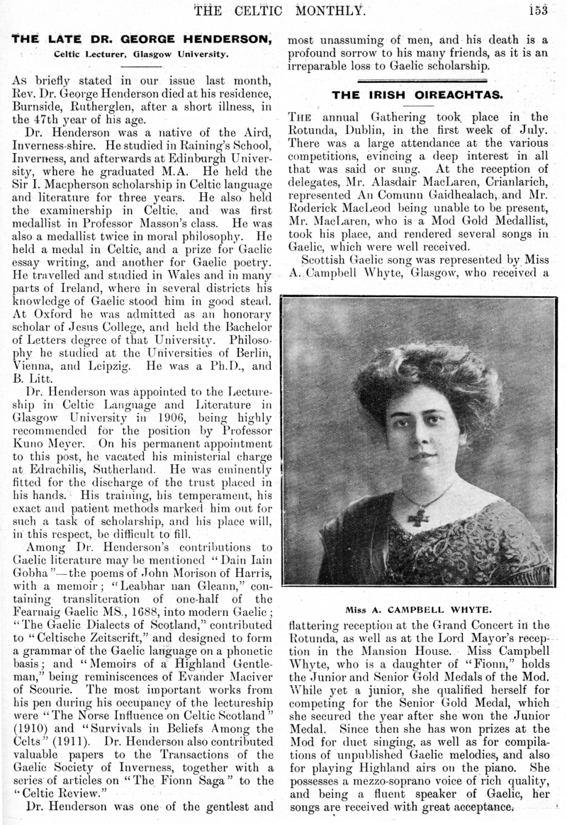 The Late Mrs MacRae, The Late Major Catto, After Culloden, The Real MacKay Tartan, The Clan Davidson, Gaelic Proverbs, Fionn's Wars with the MacGregors, The Late Dr. George Henderson, The Irish Oireaachtas, A Song of the North, Reviews, Celtic Notes and Queries, New Bagpipe Music, The Gunns, Corrievreckan in Legend, Our Musical Page, Notes on the Celtic Year.
