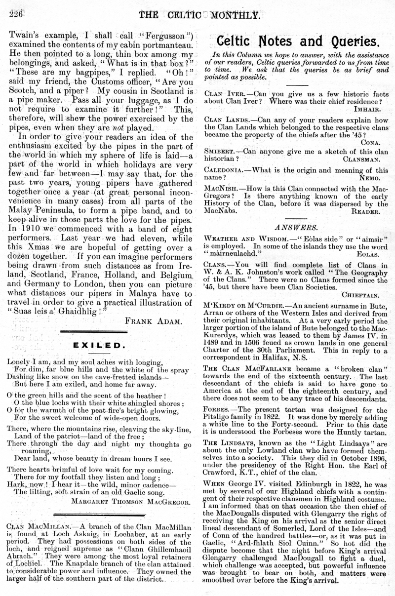 Glasgow, The Clan MacMillan, An Old Pipe Tune, Highland