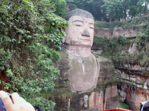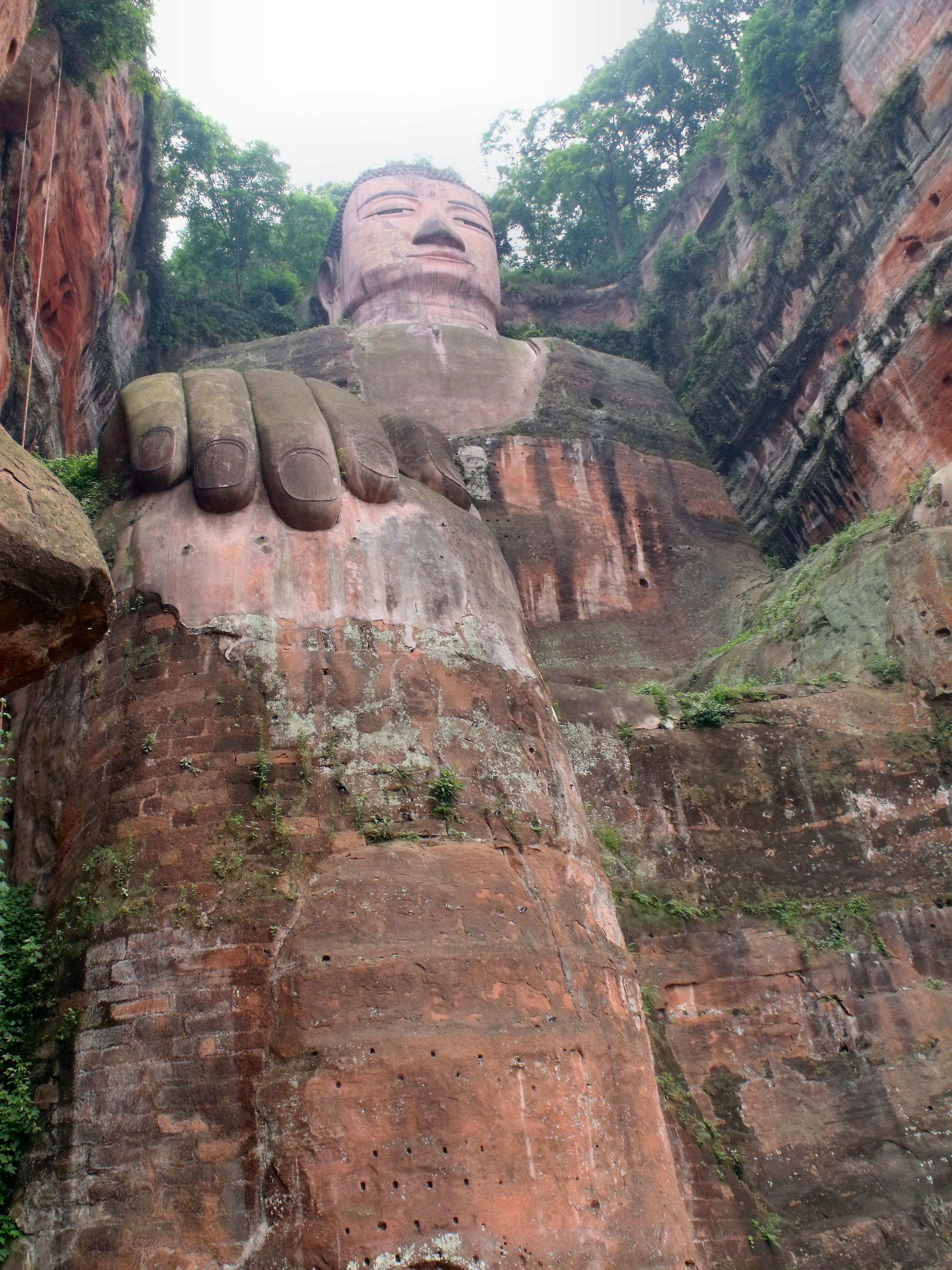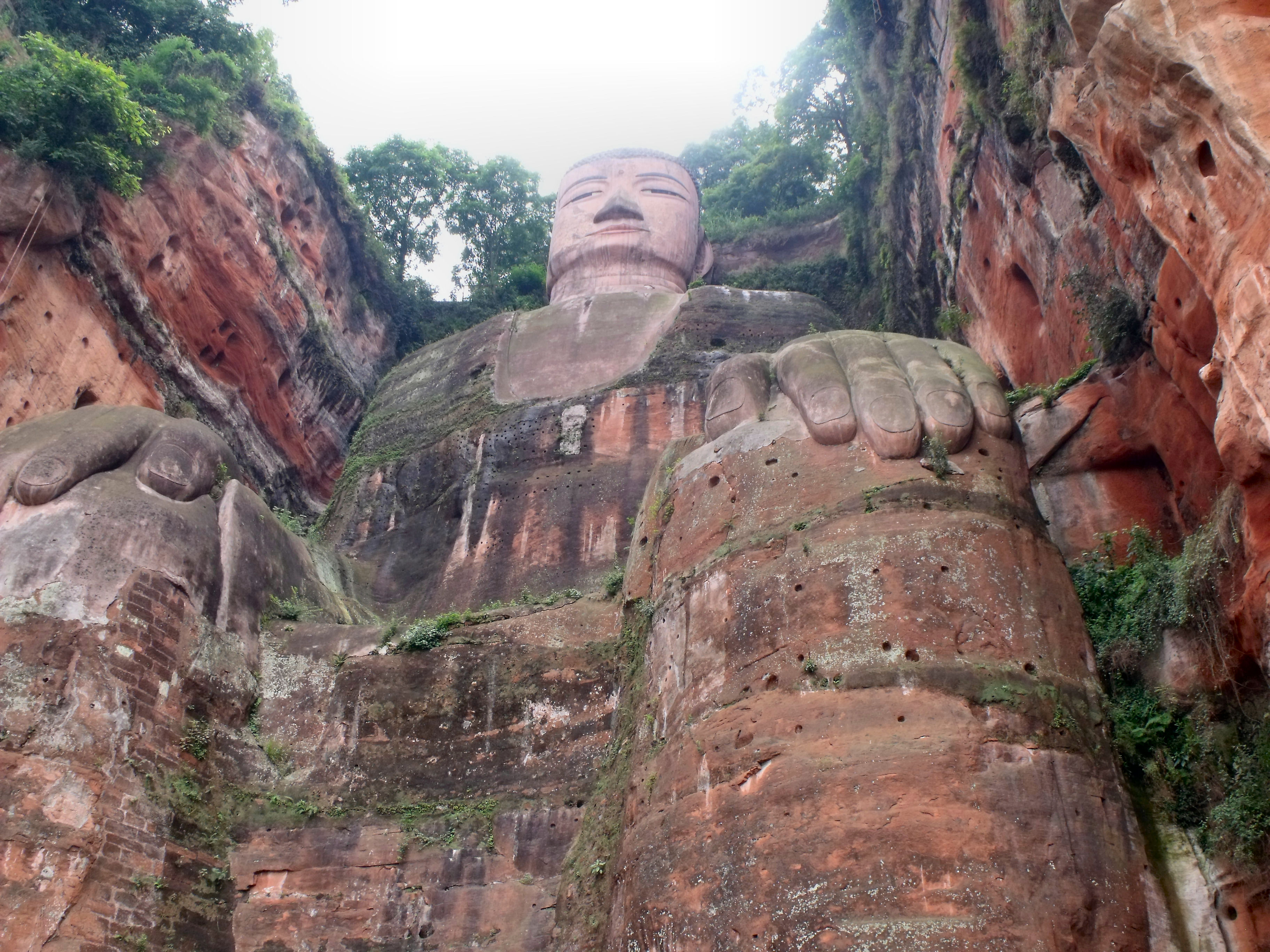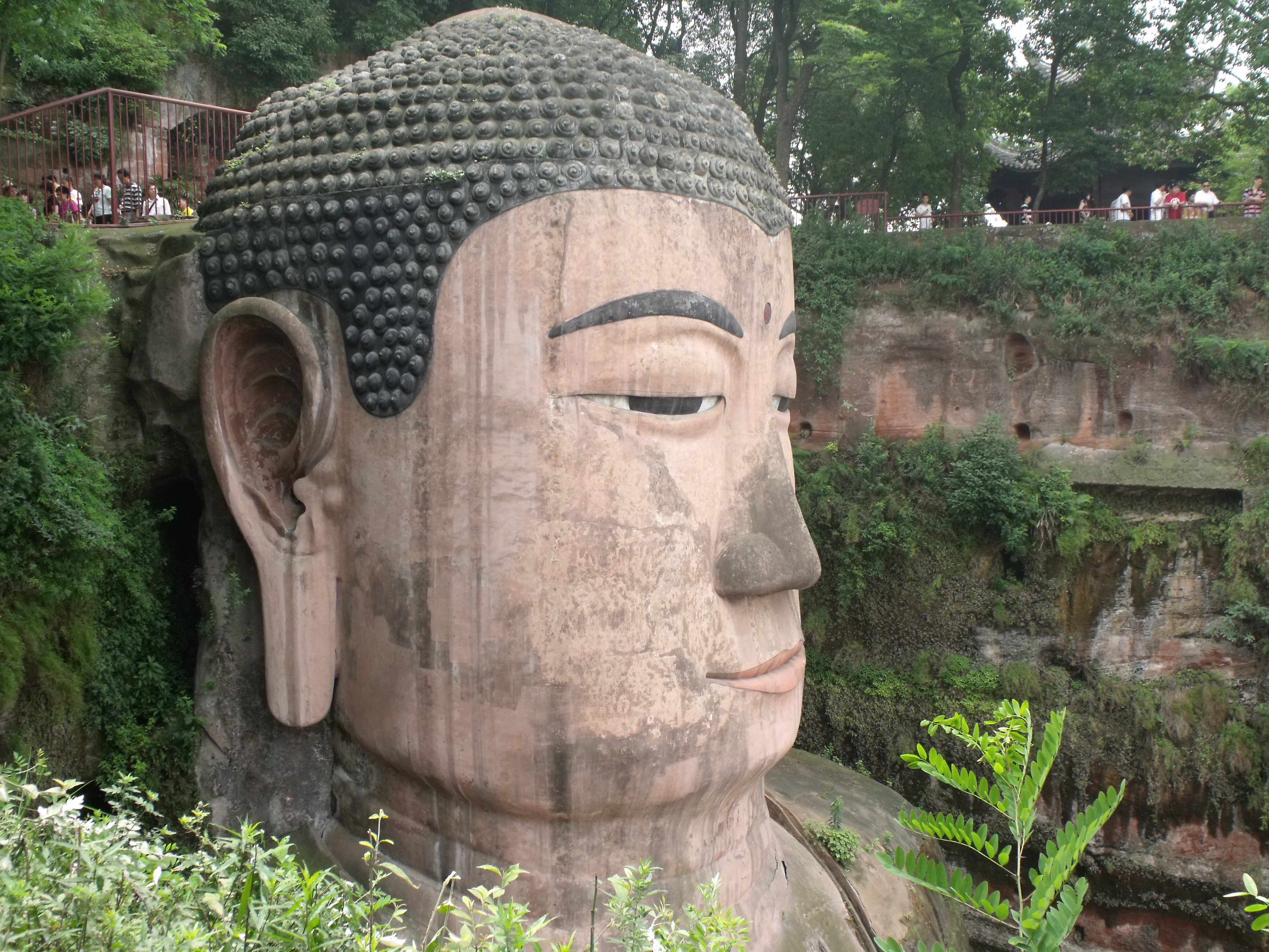 The giant Buddha sits at the entrance to the three rivers called Minjiang,