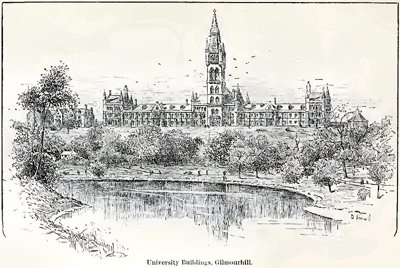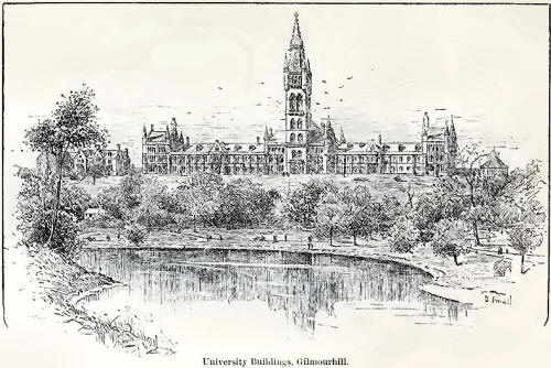 The University has now moved west; all modern life seems to tend westward, and since the time of Columbus we have pushed still further out into the new fields opening to the enterprising on the other side of the Atlantic. The new site is much more prominent than the original one in the High Street, yet no doubt in the early days the old buildings would be quite as well marked out, as the city was smaller and distances were not then reckoned by miles. Various recent endowments by wealthy citizens and others have contributed to the completion of the present buildings on Gilmourhill, and to the carrying on more completely the work of the various chairs. And not only have these benefactions resulted in the erection of the handsome modern structure, but also in the re-erecting of the old gateway, with the veritable stones cut by and bearing the chisel marks of the old builders a couple of centuries ago, and which once more throws its shadow over the student and visitor as they pass and repass to class-room and court, as in the days of old. We can also still pass up and down the old stone stairway with its guardian lion and unicorn, which was originally erected in the old college so far back as 1090.
