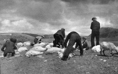 The tups are horned and many of them grow the same shape of horn as the Moufflon, smoother, wider spreading and black, quite unlike the Blackface type. The ewes are mostly hornless, but some have short, rather shapeless horns. These sheep were undoubtedly brought from Norway in Viking times and not only to Shetland but to the Outer Hebrides and West Highlands as well. These were the old "tan-faced" sheep which were here two hundred years ago and were to become extinct as Blackface and Cheviot came north in the great sheep colonization of the Highlands. There may still be people alive who remember the last of the old kind, and if any of them would care to send me any information about such sheep, I should receive it gratefully.