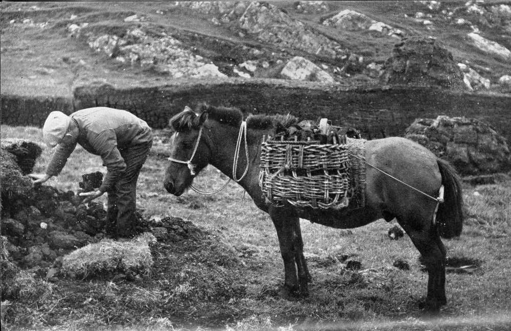 This Barra pony is a useful friend. It is a pity these hardy beasts are not more generally kept and worked with creels. Coup carts need roads which we cannot have everywhere, but a pony with creels can carry peats, potatoes or seaware out of many an awkward place and make the work of the croft much lighter.