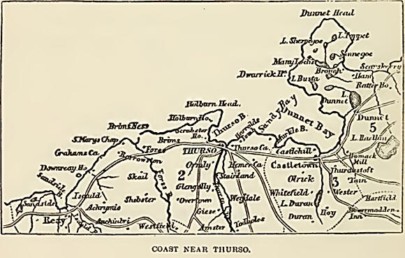 A correspondence began between Robert Dick and Hugh Miller, which went on apace. Nothing would satisfy Dick but an early visit from his friend to see the fossils actually lying in their beds. “I have some famous things for you to see,” said Dick. “ There is a head of Holoptychius, which I have left for you to pick out for yourself. There is a cranial buckler of an Asterolepis, which I want you to see in its proper site. Come, come without delay: there is no end of wonders here—no end of dead fish. Even the town of Thurso is built of dead fish!” In the meantime, to strengthen his invitation, Dick proceeded to sketch in words the scenery of the sea-shore at Thurso—east and west of the town. He gave a map in outline of the coast, indicating the convolutions of the headlands and the dip of the rocks.