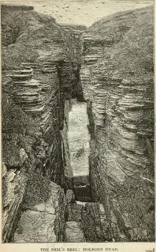 “We pass along, and walk over the Deil’s Brig. The sea washes underneath. It is one of the great goes, or gyoes, which abound along the coast. In stormy weather, the sea drives into it with overpowering force, and sends clouds of spray far inland. The Brig clearly shows the hard clay-flag of which the headland ia composed.