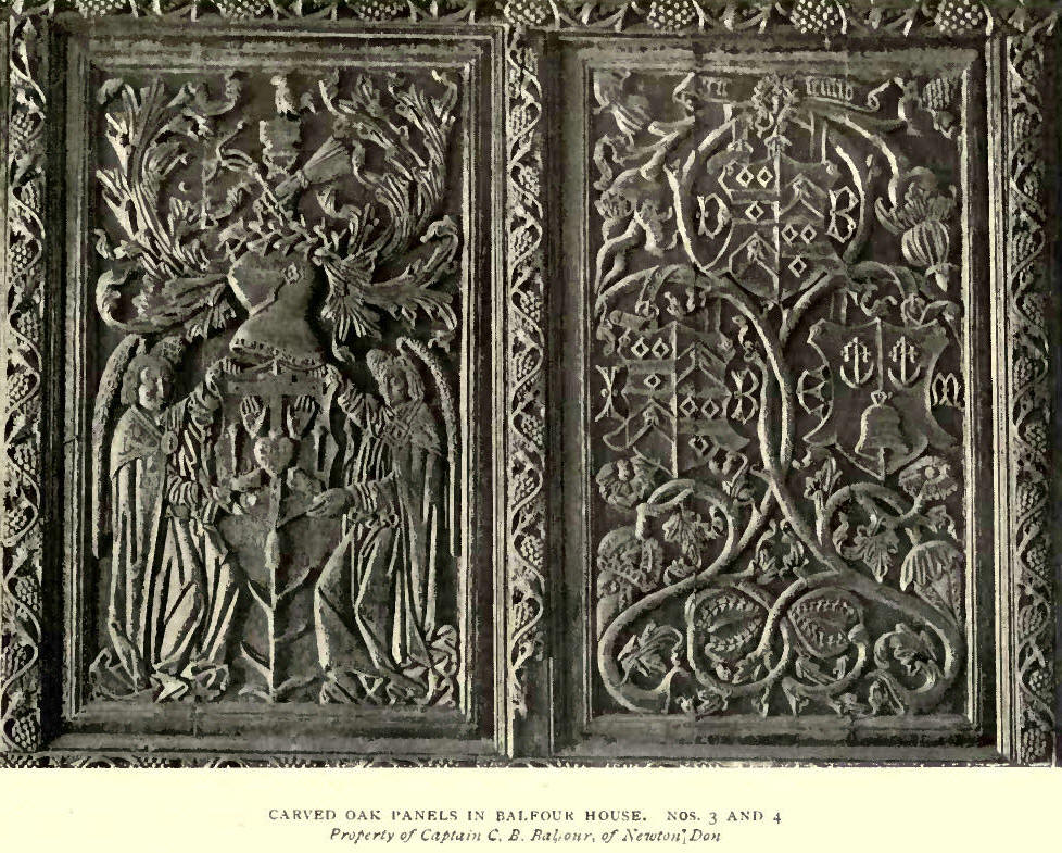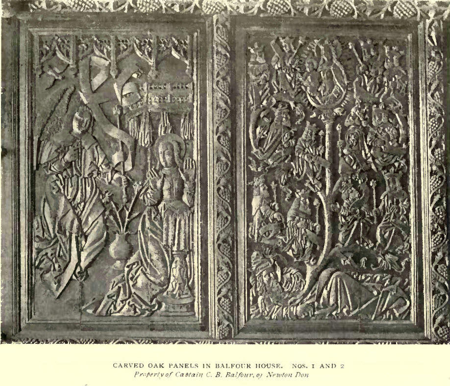 At Balfour House, in Fife, there is a set of panels, which is of greater artistic and historical interest than any of these. There are eight large panels, extending across the end of a large room, where they have been placed above the level of the doors. They are evidently of Flemish workmanship of the end of the first quarter of the sixteenth century, and they are excellent specimens of medieval woodcarving of a very rich and accomplished kind. The first panel, on the left, shows the Annunciation, the Virgin kneeling at a "lettron" (lutrin), overwhelmed by the angel's message ; the pot of lilies, the descending dove, and some Gothic scroll and canopy work complete the decoration of the panel. Next comes a panel whose subject is the "Jesse tree." Jesse is shown recumbent below, while from him springs the tree bearing his descendants and culminating in the Virgin and Child at the top. The third is a sacred heraldic panel, the shield being charged with the emblems of the Passion, while two angels act as supporters; on the helm is the crown of thorns; the scourge, the crowing cock and other emblems occur in the crest. After this we have a panel with the arms of Cardinal Beaton and a pastoral staff; and below are the arms of the Cardinal's father, John Beaton, and his mother, Elizabeth Monipenny, of Kinkell, the whole surrounded with a beautiful design of pomegranates. The fifth panel is carved with the Scottish arms, beneath which a thistle is introduced between the supporters. The sixth and seventh have decorative designs of various plant forms, among which the rose and the thistle are employed; while the eighth panel is ornamented with an arrangement of carved bosses with heraldic and other motives.