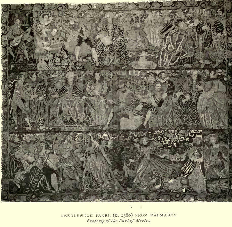 Another set of petit point hangings traditionally attributed to Queen Mary is that belonging to the Earl of Morton; and its uninterrupted ownership, from the sixteenth century to the present day, by Regent Morton and his descendants might well seem to support the tradition. But, in the first place, it is impossible that work of such rare beauty and such intricate richness could have been produced by Mary and her ladies, and above all at Loch Leven where there was no artist to execute the design. Mary was only eleven months in Loch Leven. By June, 1568, she had left Scotland. Though it is extremely difficult to deduce an exact time from costume, still the costumes in these hangings appear to be later, rather than earlier, than 1568 ; and if this is so they are hardly likely, supposing them to have been worked by Queen Mary, to have come to Scotland and into the hands of Regent Morton. (Plate VIII).