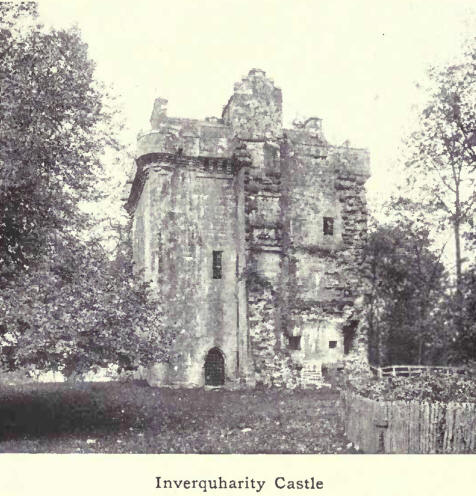 One of the finest ruins of the county, Inverquharity Castle, is situated on the South Esk near the point where that river is joined by the Carity Bum. It formed another of those defences against raiders down Glen Prosen or Glen Clova. Built by one of the Ogilvys, it is a large, square, battlemented tower, with walls 9 feet thick. The castle possesses one of the few iron gates, or “yetts,” met with in the county, for the use of which a special licence from the sovereign was required. In the neighbourhood are the ruins of Clova Castle. Cortachy Castle at the junction of the Prosen and the South Esk, has a name that is said to indicate the nature of its site— “the enclosed ground.” Shut in from the surrounding world by hills and woods, it is built in an ideally sequestered spot. Like so many others in Forfarshire the castle consists of portions built at separate periods; but not even its oldest part, a circular tower terminating with a square corbelled superstructure, looks as if it had been a fortress, though in the early sixteenth century, when it seems to have been built, it must have served to some extent as a place of defence as well as residence.