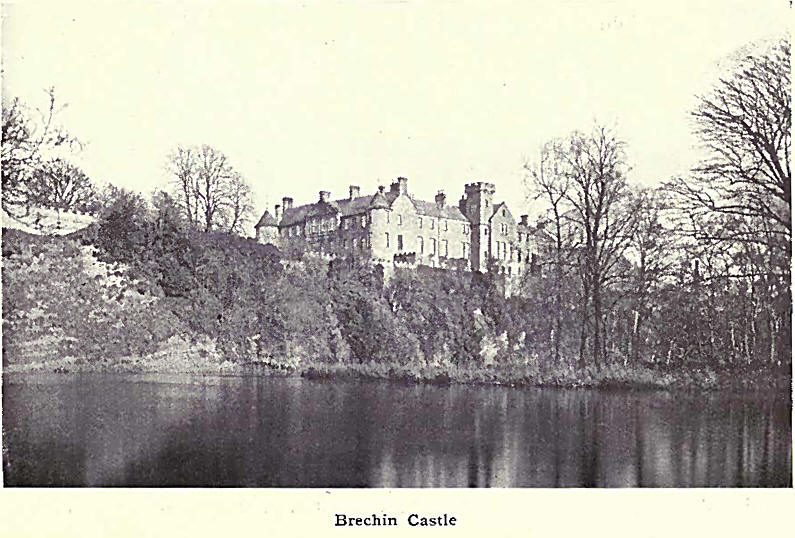 Brechin Castle, however, is the chief seat of the Earl of Dalhousie. If devoid of the architectural adornments of Panmure and other homes of the Angus nobility, Brechin Castle, as we have already seen, can vie with any in historical interest. The west front of the castle is its main fa9ade; its centre is characterised by a fine pediment; and the corners of the building are adorned with cone-capped towers. The square tower which forms the highest portion is surmounted by the flagstaff' of the Redan fort at Sebastopol, which was presented to Fox Maule, War Secretary at the time of its capture. A fine battlemented wall tops the cliff on whose summit the castle is built and faces the river. In the castle are valuable paintings and a still more valuable library. The exquisite grounds and gardens extend westwards along the banks of the South Esk.