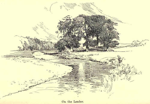 For three miles below Lauder the river curves between its red banks through wide meadows, and shorthorn cattle cool their legs in its stony shallows. By the roadside here and there, beneath the shadows of umbrageous oaks and soaring ash trees, stand real old-fashioned homesteads in which, or upon their sites at one time or another, lived various members of the Lauder clan. One of these, St. Leonard's, has a Latin inscription let into the wall of what is held to be a fifteenth-century chapel, and of which I could only make out that the first four words were "Deus est Eons vitae." The highway crosses the Leader to its eastern bank by a stone bridge, which may he aptly regarded as dividin; Upper from Lower Lauderdale. Berwickshire, too, here crosses the river, which henceforward, running down to Earlston and the Tweed, parts that county for much of its beautiful course from Roxburghshire, with its disconcerting habit of thrusting fragments into the vitals of its neighbours. There are no more meadows and farms in the valley now. The hills press in, and, for the most draped in tangled woods, rise to an imposing height above the Leader, and leave it but a narrow trough in which to fret its downward way. It is a beautiful gorge, whether standing in the clear stream below or looking down from the high road far above through vistas of foliage on to its flashing waters.