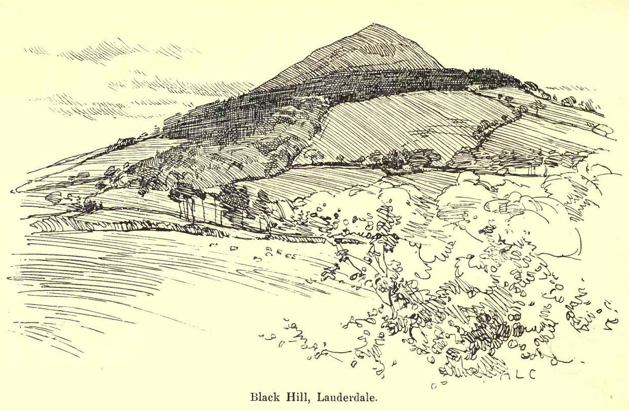 Still onward between the two counties, through beautiful and woody depths with sloping timbered parks and pastures, and bosky steeps, shooting up into lofty, and here even rugged hills, the Leader for these last four miles pursues its resounding course. Much of it runs through the estate made familiar by the well-known Scottish ballad "The broom of the Cowden knowes," which together with that of "Leader haughs and Yarrow," was written by Crawford 200 years ago. The high road winding along the breast of the hill above towards the Tweed and Melrose affords a continuous view of what is, perhaps, the most striking bit of Lauderdale, with the Black hill lifting its pointed cap a thousand feet above.