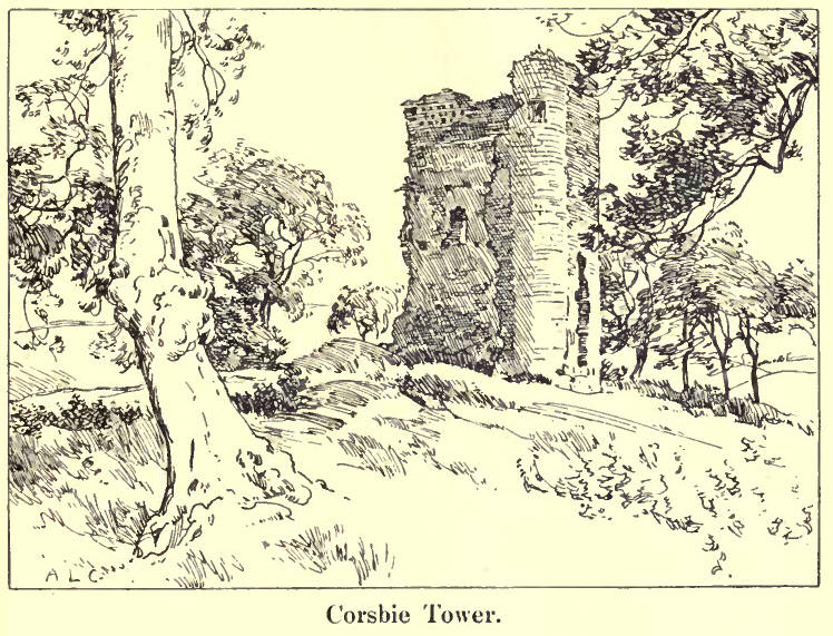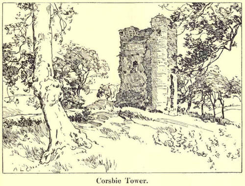A half mile below Ledgerwood church, in a marshy flat that once made a virtual island of the green knoll on which it stands, is Corsbie Tower, an old pele of the Cranstouns, who, it will be remembered, assisted at the wiping out of the last active Lauder of Lauder. And reverting once more to that notable family, Carol-side seems to have been actually the last spot owned by any of them in Lauderdale. An eccentric old gentleman, says a recent historian of the family, well known in Edinburgh, where he mainly lived, as Beau Lauder, wore garments so belated in fashion as to be the sport and joy of the city gainins, who dogged his steps. For long after such decorative apparel had died out, the cocked hat, scarlet coat, laced ruffles, silk stockings, and shoes fastened with gold buckles studded with gems, of Beau Lauder were familiar upon the streets of Edinburgh. But his means, apparently, were not in accord with his gaily-caparisoned exterior. He lived alone, and was accidentally burned to death sitting in his chair in 1793, thus extinguishing the last family links with Lauderdale.