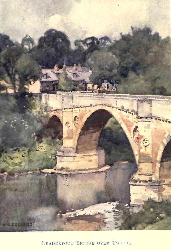Both the Leader and the highway, the one to deliver its tribute, the other to mount a noble old stone bridge, join the Tweed within almost a stone's-throw of one another. It is a fitting place to end our journey. For the downward prospect from the many-arched stone bridge of the broad shallows of the greater river into which the Leader rushes out of her woody depths is a scene well worthy to be numbered among the fairest we have wandered in all these chapters. I may fairly leave my reader to cross the Tweed under other auspices into the Scott country, and into scenes celebrated by pens innumerable. The scheme of my modest intentions ends abruptly here at Leaderfoot. hitherto we have not often trodden upon soil, whether plain or mountain, that is ever pressed by the foot of alien travellers, or that the outer world, speaking generally, knows anything about. Across this bridge, however, the situation wholly changes. Up to its first arch my conscience is in this respect tolerably at ease. The bridge at Leaderfoot might almost stand for the Rubicon between the known and the unknown. Beyond it both our pen and pencil would most assuredly lose such justification as I have ventured to proffer for them. A sense of the fitness of things, so far as this and our pleasant labours are concerned, calls here for an abrupt halt, and none too soon, for the limitations of space to which I had proposed to confine these chapters. Just beyond, the Eildon Hills with their