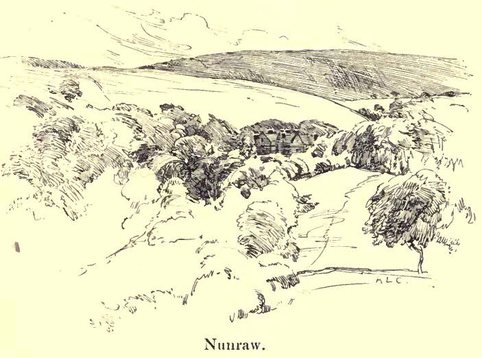 I stood here again, as these pages testify, but the other day, though with no horse unhappily beneath me, and looked out over the once familiar scene. As we are, descending into it anon, however, I shall not dally here over a prospect that could only tempt one to touch on distant scenes that will doubtless be encountered presently at closer quarters. It is enough for the moment that only men and times and points of view have changed. No bit of Britain within the compass of a generation has superficially altered less. But of this later, while for the moment it is worth noting how much more precipitously this northern edge of the Lammermoors drops to the low country, as against the more gradual fashion in which their southern bounds, for the most part, dip to the Merse, shedding their wildness by degrees as they slip into the flat low country. Here on the north they tumble in fine shoulders of purple drapery and in steep wooded combes to foothill farms, where the ploughman and the shepherd may be said to divide dominion. Newly-born burns—for the wide watershed of the Whiteadder, as we have seen, is pressed right up to the northern wall of the moors—leap rejoicing down steep, bosky glens, amid birch and bracken and native oak, to find their way eventually by lBeil and Belton to the sea or to the Tyne, which drains the county of East Lothian from end to end. Away to the right, at the foot of the range, are the woods of Mr. Balfour's home at Whittinghame, with the humped back and ribbed sides of Traprain Law cast up behind them. To the left you may look down over the masses of foliage which mark the village of Gifford and Lord Tweeddale's seat of Yester. Immediately beneath, however, on the track of the steep road, which dives sharply down many hundreds of feet, is Nunraw, the seat, when I knew it, of a branch of the Hay family, but sold this long time. The house had just then been recently enlarged, but the ancient portion of the typical Border style remained, and still remains. It is not, however, the architecture, nor the true history of Nunraw, nor yet the beauty of its site tucked under the Lammermoors with a deep woody dene threaded by a mountain stream running immediately under it, that is for the moment of interest. For I have had the hardihood all my life to cherish a conviction, and carry it about with me, that Scott had Nunraw vaguely in his mind as the original of Ravenswood House. I had made up my mind in youth when circumstances kept me hereabouts, often for days together, that this was the scene of the unhappy loves of Edgar and Lucy; that the woody burn in the grounds was that same one where they broke the coin and plighted their troth; that the high-pitched rooms had witnessed the haughty scorn of Lady Ashton, the temporising craft of the Lord Keeper, the memorable tragedy of the bridal chamber; that the village kirk of Garvald, just below, was the scene of those two gruesome and near events, the marriage and the funeral of the bride. The romantic beauty of the place and situation lent zest to these dreams, which only youth could enjoy quite so thoroughly. In this matter of the precise situation of Ravenswood, every now and again a correspondence upon the subject breaks out in the Scottish press. The