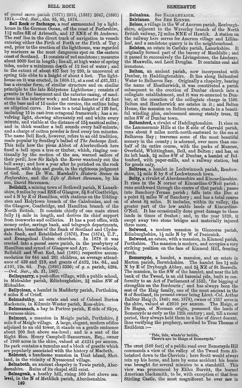 Bell Rock or Inchcape, Bellshill, Bellsquarry, Bellycloan, Belmaduthy, Belmeanach, Belmont, Belnaboth, Belnagoak, Belnahua, Belrinnes, Belses, Belston, Belton, Beltonford, Beltrees, Belty, Belwood, Bemersyde