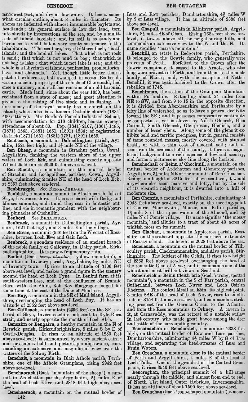 Benbeoch, Ben Bheog, Ben Bheula, Benbhraggie, Benblath, Benboard, Benbrack, Ben Breac, Benbreck, Benbui, Ben Buy, Ben Caileach, Bencairn or Bengairn, Benchait, Benchaorach, Benchacrach, Ben Chapull, Benchill, Benchinnan, Benchochail or Beinn a' Chochuill, Ben Chonzie, Ben Clachan, Bencleuch, Benclibrick or Beinn Cleith-bric, Bencoinachan or Benchorach, Ben Creachan, Bencroghan, Ben Cruachan