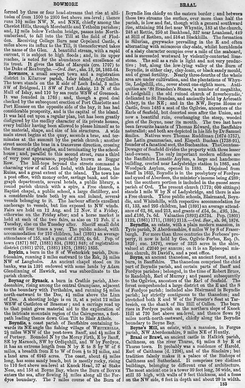 Bowmore, Boykin, Boynag or Bynack, Boyndie, Boyndlie, Boyne, Boyne's Mill, Braal or Brawl